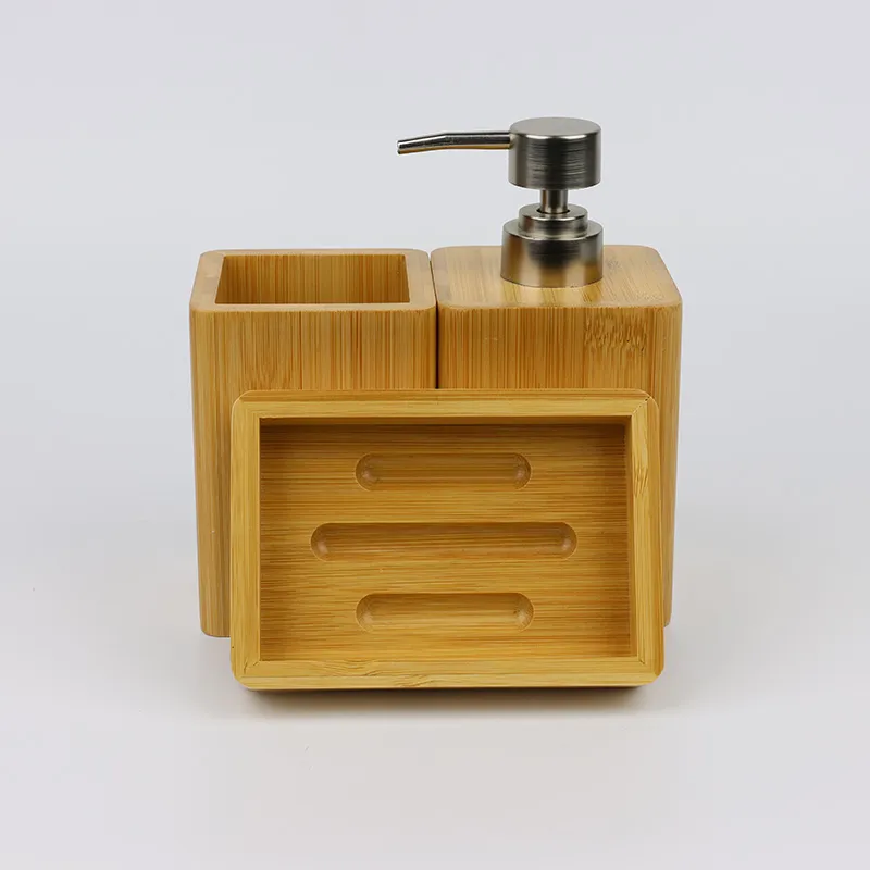 BrandBAMBOOHOODPlace of originFujian,ChinaUsageBathroomColorCarbonizedMaterialSolid laminated BambooMOQ500SetsComplete Bathroom Accessories Set 3 pieces Bamboo bathroom combo Includes : Toothbrush holder, Soap dish and Lotion dispenser.Product Size:Toothbrush holder: 2-7/8" x 2-7/8"