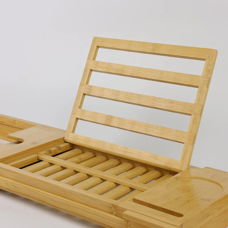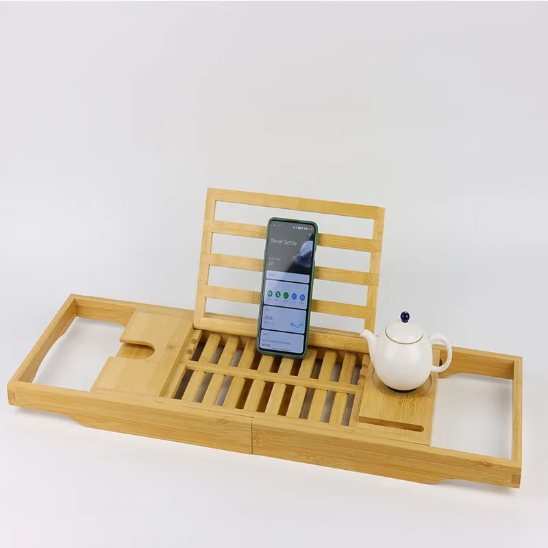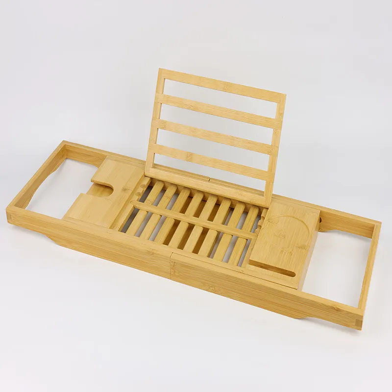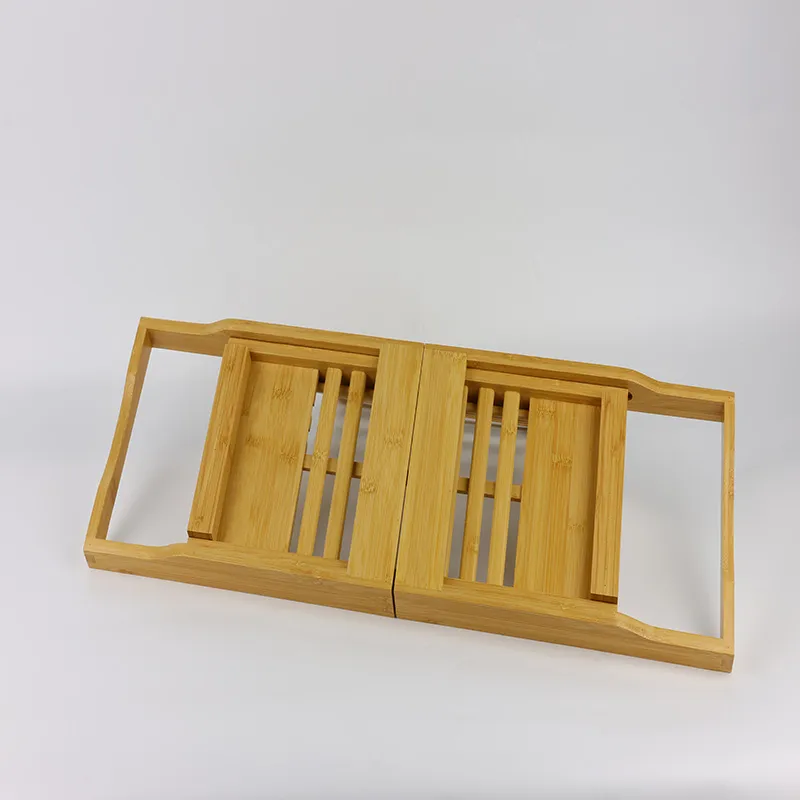 BrandBAMBOOHOODPlace of originFujian,ChinaSize(70-105)*23*4.5cmUsageBathroomMaterialSolid laminated BambooMOQ500PCSBamboo bathtub trayis made of Solid laminated Bamboo for long-lasting strength and durability.Bath tray has compartments for holding a book or tablet, wine, snacks, or